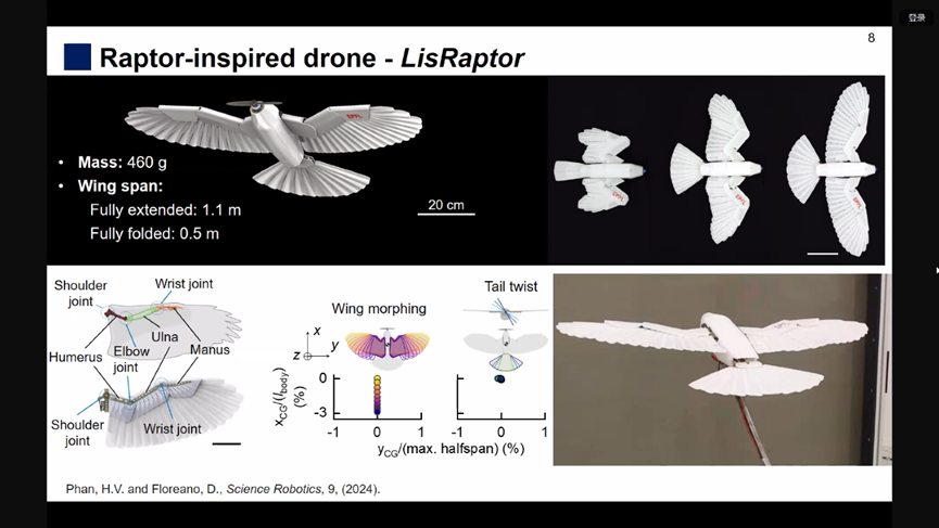 Hoang-Vu Phan研究员介绍了其参与研制的三种不同构型的仿生飞行器,它们的设计灵感分别源自昆虫和鸟类。LisRaptor是一种仿猛禽扑翼飞行器,通过扭转尾翼产生非对称升力和滚转力矩。这一机制使得LisRaptor不仅可以低速稳定盘旋,还可以完成高速急转弯。
