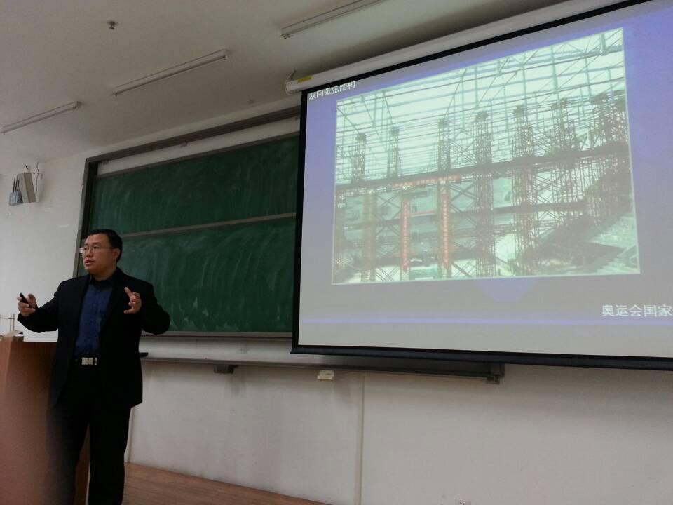 2013年12月25日星期三下午,北京建工集团设计公司经理秦杰老师在三号教学楼103教室为交通学院土木工程类专业的学生举办讲座“建筑结构工程漫谈”。机场与道路系系主任陈军副教授和2013级辅导员王庆冬参加了此次讲座。